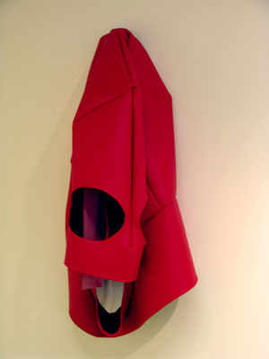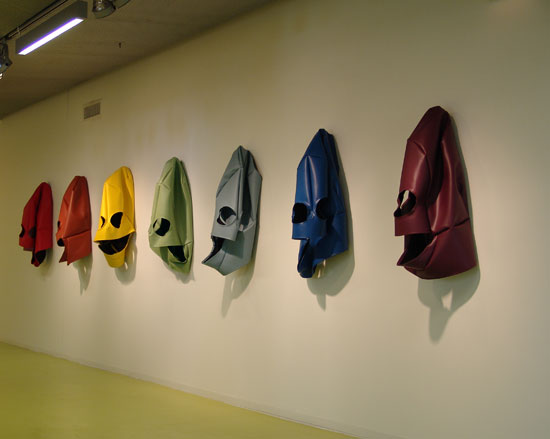 This piece, consisting of 7 gigantic vinyl masks in a range of colours, was shown in: The Adventurous Type at the Hyde Park Art Centre in Chicago Illinois, March 18 May 13 2007. Curated by Allison Peters.